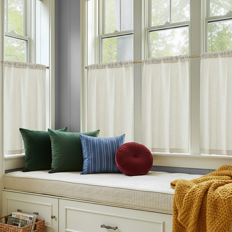 Choisissez des tissus doux et chaleureux comme le lin épais, le velours léger ou le coton moelleux. Les couleurs pastel, neutres ou naturelles créent une ambiance cosy. Les rideaux longs et légèrement froissés ou à pattes donnent une sensation de confort et de détente.
